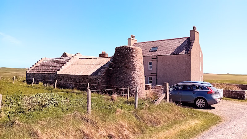 The Bu of Burray (Bow Farmhouse) – Category B listed building. Historic Environment Scotland (HES) describes the farmhouse as a three-storey mansion built around 1800 on the site of The Bu. They report that the interior has a ‘fine winding stair with solid newel’. The listing includes several outbuildings – ‘one with a heraldic panel dated 1649′ and a well’. The farmhouse backs onto sandy mounds, which in turn link to an extensive beach. Like many of the listed buildings, this is a private residence, and the occupants’ privacy must be respected.