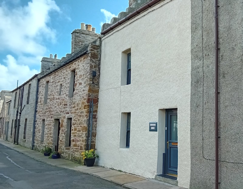 Lairdene, aka Waterside, Front Road, St Margaret’s Hope, South Ronaldsay. Described by Historic Environment Scotland as later 18th century, it is similar to Swanson House but features a harled exterior. [See also, trove.scot].