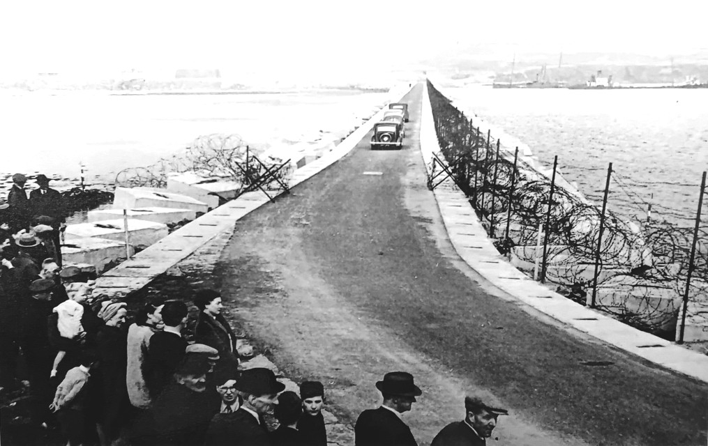 Built between May 1940 and September 1944, the four Barriers were constructed on the order of the First Lord of the Admiralty, Winston Churchill (hence Churchill Barriers). This followed the sinking of HMS Royal Oak in Scapa Flow in 1939. The boat was anchored just off the coast west of Gaitnip Hill. [When travelling from Kirkwall on the A961 down to St Mary’s and the Barriers, it is roughly opposite St Claire Farm]. Entrances to the Flow from the North Sea had been protected by sinking ships during the First World War, but were vulnerable to German U-Boats/submarines. The Historic Environment Scotland site provides a full discussion of the construction and development of the Barrier.