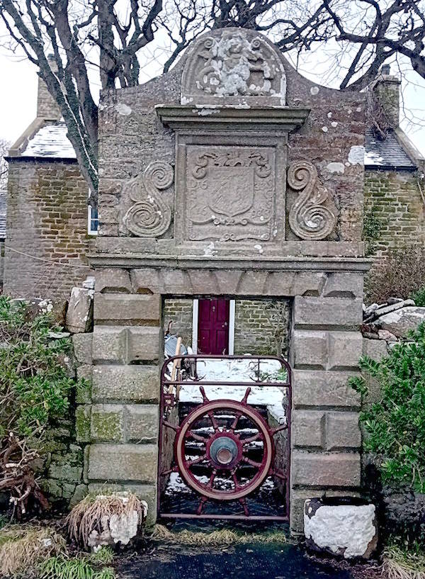 Historic Environment Scotland describes it as a rusticated 17th-century gateway with a moulded cornice and ‘surmounted by a heraldic panel (dated 1633 and 1693) supported by scrolls. It includes the figure of a mermaid. The gateway was previously just around the corner, looking out onto what became the main farmyard. The previous mansion building was the (probably a) home of David Sutherland of Windbreck, and faced in that direction (north). It is his coat of arms that features in the carving. [See also, trove.scot].