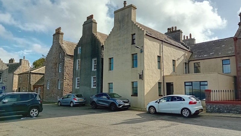 Swanson House, Front Road, St Margaret’s Hope, South Ronaldsay. The Historic Environment Scotland description is: Later 18th century. Traditional. 2 1/2 storeys. Rubble. Corbie-stepped end to road. Caithness slates. [See also, trove.scot].