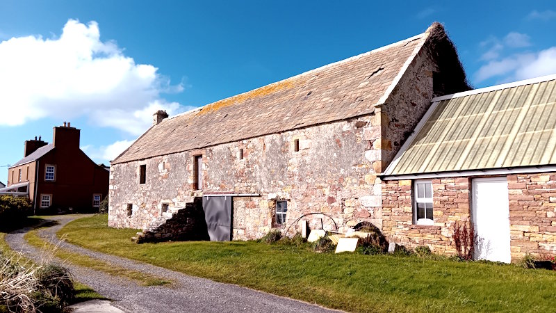 The Old School House – Kiln Barn, Barswick, South Ronaldsay. Historic Environment Scotland Category C Listed Building. It is described as being built in the 19th century with a central single-storey threshing barn flanked by a rectangular kiln and byre. With pitched roofs, the barn roofing is now corrugated roofing, but flagstones remain on the kiln and byre. The kiln is described by Historic Environment Scotland as ‘an important survival from early Orkney farming practices. Kilns were used to dry corn before grinding and also for drying malt for making ale’. Click to read more. [See also, trove.scot].