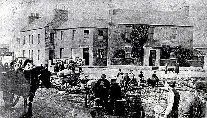 For many years, the pier next to the propeller was the main point for people to embark on and disembark from steamers and ferries. They were taken to and fro on smaller boats. It was also the place where mail arrived (and much of it was taken from here to Kirkwall). Across the main road, you can see that what became the Legion Hall (and now a house) was then a shop (D. McBeath’s). Indeed, quite a few of the buildings on Front Road were shops and are now wholly residential. [Click to hear Dick Brown talking about the shops on Front Road].